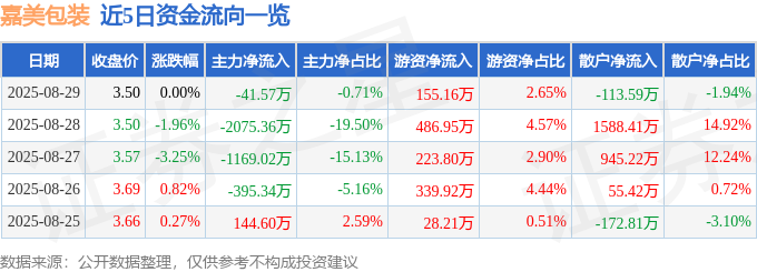 开云真人证券之星消息,截至2025年8月29日收盘,嘉美包装(002969)报收于3.5元,上涨0.0%,换手率1.76%,成交量16.73万手,成交额5856.57万元开云真人。